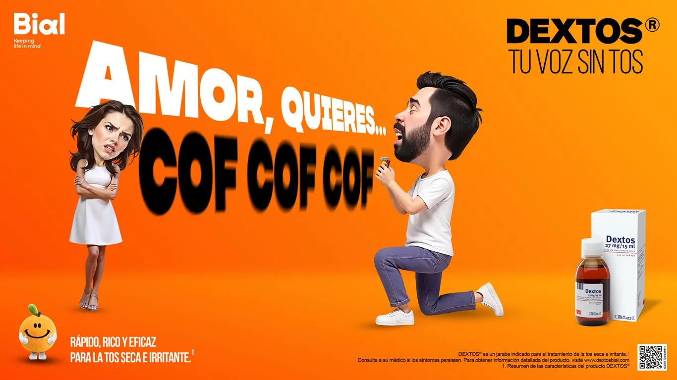 Un concepto creativo anclado a un código cultural de la región, con el humor y ligereza que la caracterizan. Situaciones universales donde la tos rompe el ritmo social y Dextos lo devuelve. Una identidad visual renovada, llevada a la animación para amplificar el mensaje, dando protagonismo al personaje de la marca que habla del rico sabor del producto: La naranja. La campaña con más impacto del laboratorio BIAL en la región
